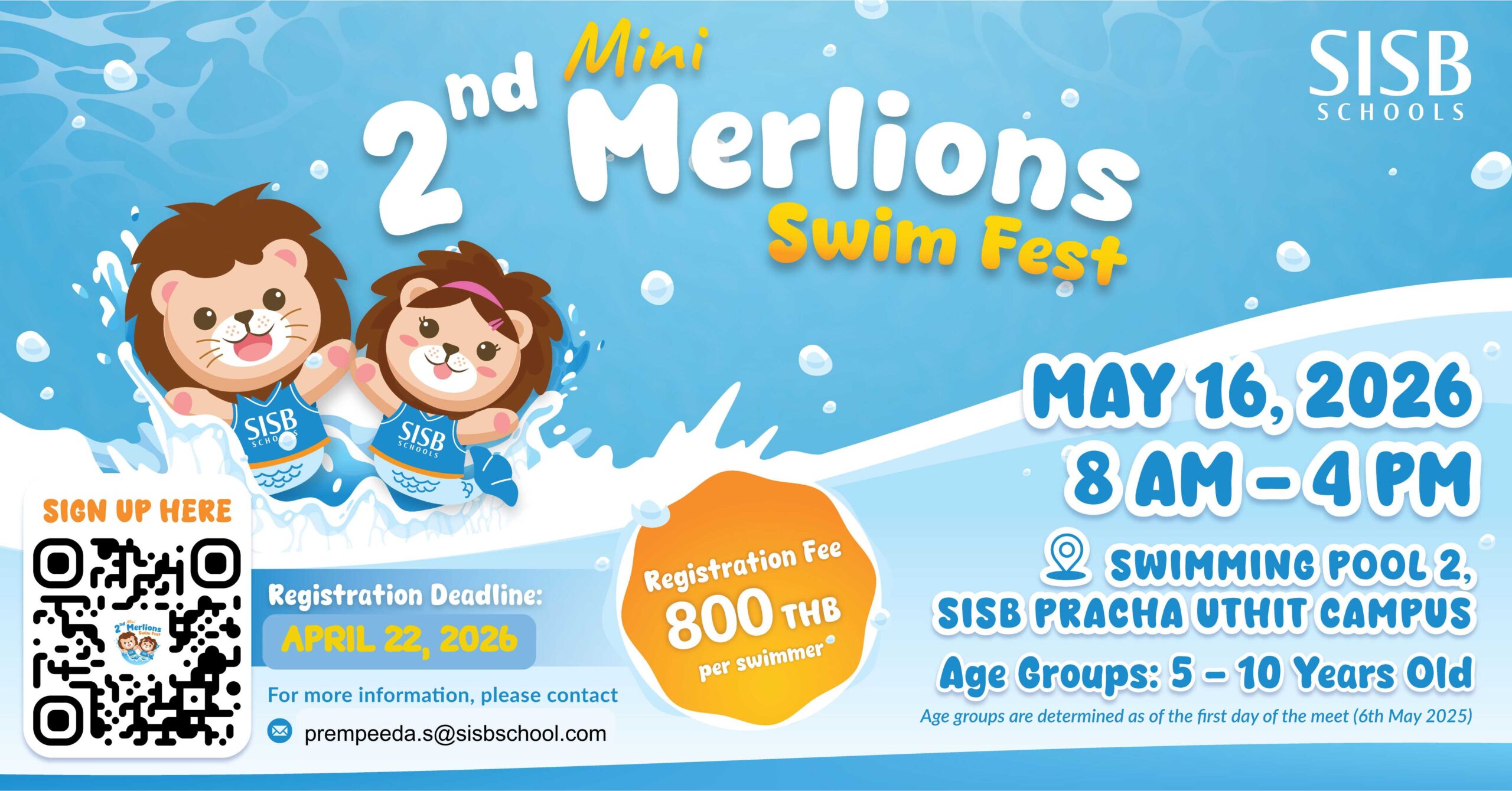 | พฤษภาคม | 16 | Mini Merlion Swim Fest 2026 | 25M | SISB Pracha Uthit Campus, Bangkok | เปิดรับสมัคร | |